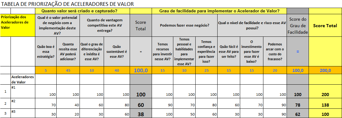 Essas perguntas devem ser respondidas pelo grupo que está avaliando os aceleradores de valor e devem chegar a um consenso. Para facilitar a priorização devemos atribuir pesos para cada pergunta. Esses pesos podem variar de empresa para empresa. A soma ponderada das respostas as perguntas definirão e classificaram os aceleradores de valor. Veja uma tabela exemplo: (clique na tabela para ampliar)