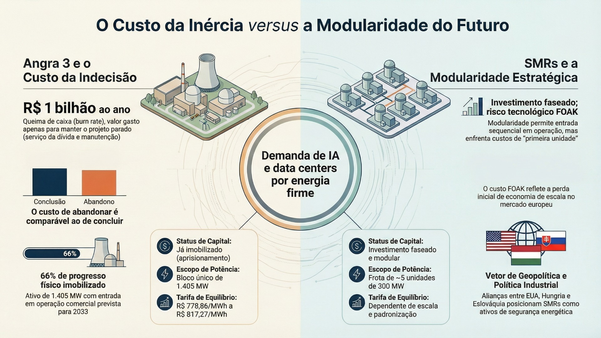 O debate sobre Angra 3 não é mais apenas sobre concluir uma usina. O ponto é decidir como o Brasil governa infraestrutura crítica quando o custo de não decidir é recorrente e visível. Com 1.405 MW projetados, Angra 3 concentra um dilema clássico: capital já imobilizado, cronograma pressionado e um passivo que cresce enquanto a obra não entrega energia (ELETRONUCLEAR, 2026a). Mas há um segundo movimento, externo ao Brasil, que reorienta a conversa: Estados Unidos, Hungria e Eslováquia vêm formalizando cooperação nuclear civil e reposicionando cadeias de suprimento e alianças energéticas na Europa Central, com SMRs no radar (UNITED STATES, 2025; ANS, 2026; WASHINGTON POST, 2026). O que está em jogo agora é a credibilidade do planejamento energético em um mundo onde energia firme volta a ser ativo estratégico, pressionado por infraestrutura digital e por disputas de influência. O risco, portanto, não é só de custo e prazo; é de coerência institucional, bancabilidade e reputação.