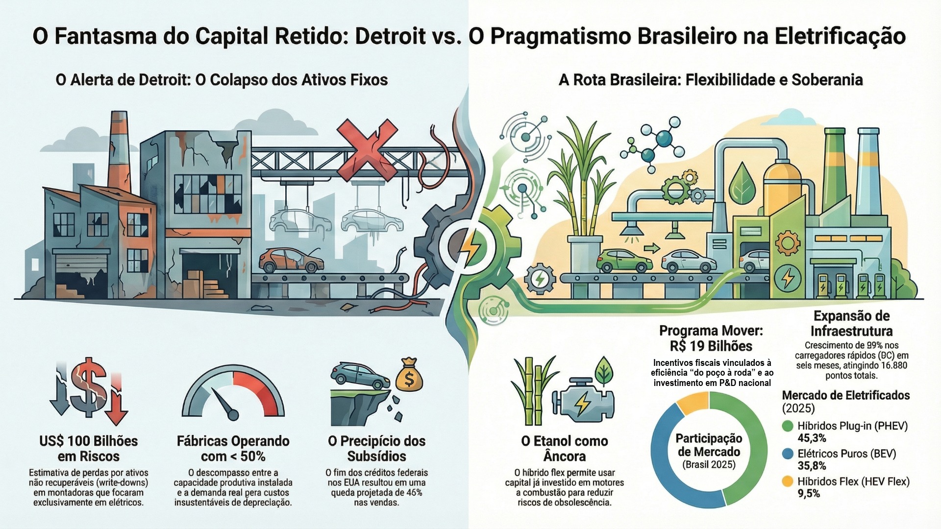 - Híbrido Flex como Amortecedor: Diferente dos EUA, o Brasil possui a “âncora” do etanol. O mecanismo do híbrido flex permite que as montadoras utilizem o capital já investido em motores a combustão, adicionando eletrificação de forma modular. O efeito é a preservação da margem operacional e a redução do risco de obsolescência das fábricas atuais. A implicação é que o Brasil pode atingir metas de descarbonização sem os mesmos níveis de imobilizado perdidos de Detroit.