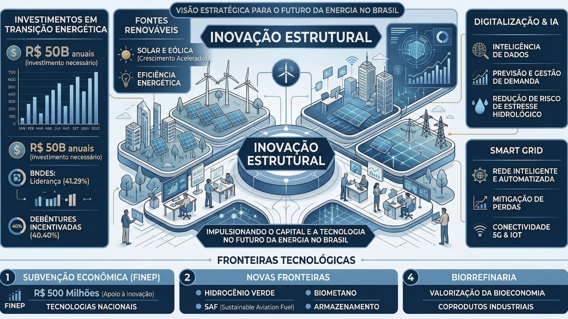 | Cenário Otimista | Aceleração da digitalização e sucesso na implementação de hidrogênio e baterias. | Entrada massiva de venture capital em energytechs; queda no custo do armazenamento. | Redução do custo marginal de energia e liderança na exportação de combustíveis verdes. | Investir em P&D disruptivo e parcerias para TRL elevado (acima de 7). |