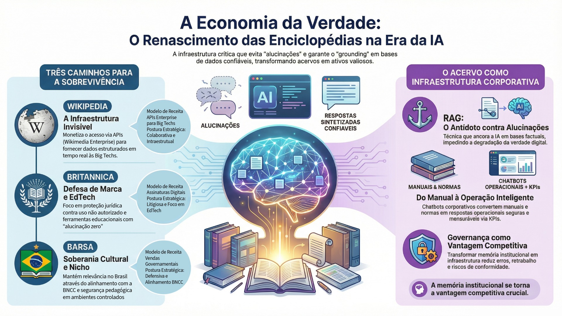 Simultaneamente, a reação da Encyclopædia Britannica e da Barsa demonstra que, na era da alucinação artificial, credibilidade humana e responsabilidade editorial tornaram-se ativos raros, defensáveis e monetizáveis. A Britannica aposta no litígio e em produtos proprietários para proteger a integridade de sua marca e o valor econômico do seu acervo; a Barsa, por sua vez, se ancora na especificidade cultural e no alinhamento pedagógico brasileiro como forma de manter relevância e autoridade em um mercado institucional que valoriza controle, curadoria e previsibilidade.