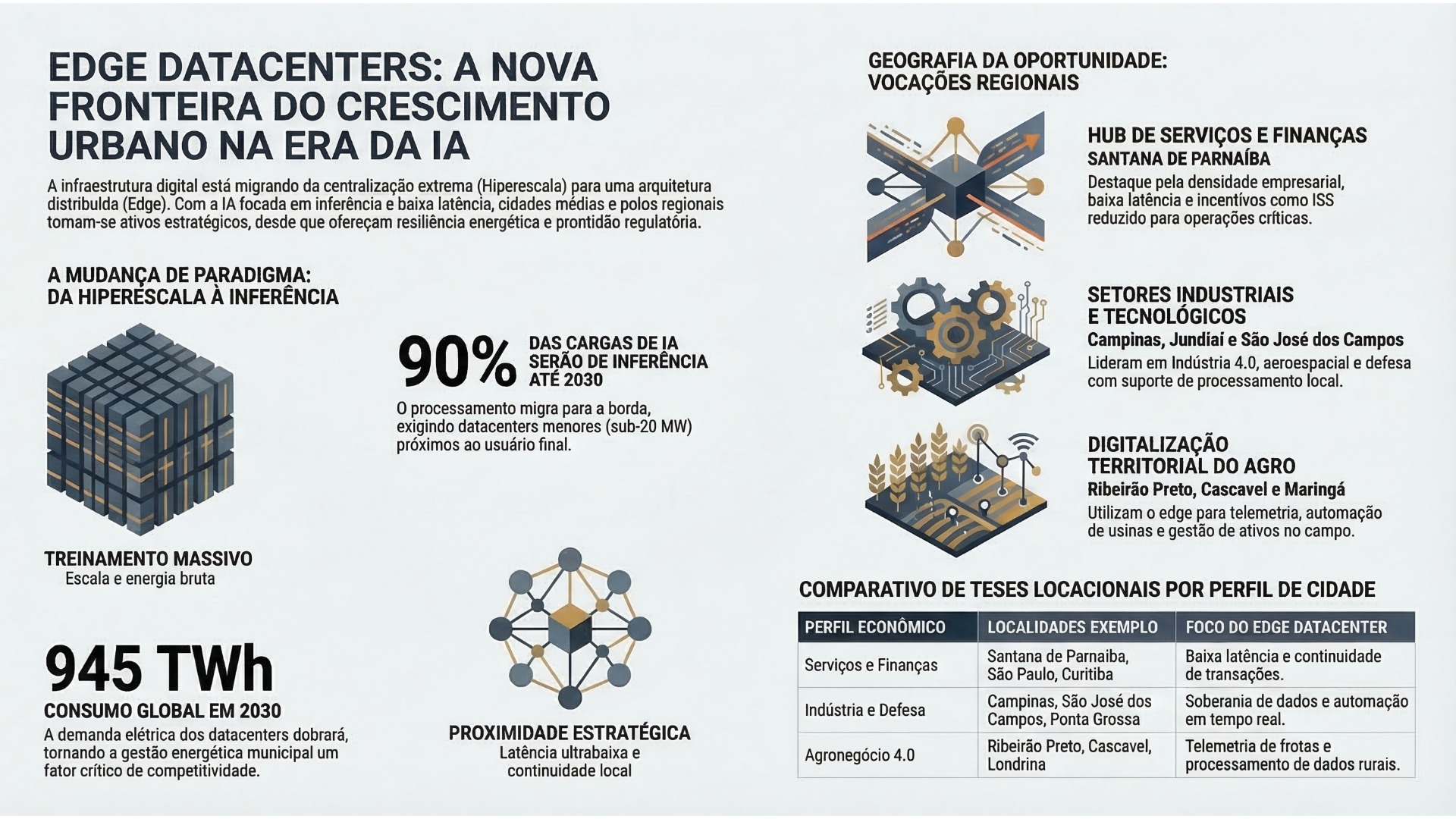 A infraestrutura digital entra numa nova fase. O ciclo anterior foi dominado pela lógica da hiperescala: grandes campi, forte centralização de carga e economias de escala orientadas por capex, conectividade troncal e contratos de energia de grande porte. Esse desenho continua relevante para treinamento de modelos e armazenamento massivo, mas deixa de ser suficiente para sustentar a próxima onda de valor da Inteligência Artificial. A razão é estrutural: a expansão da IA eleva a demanda elétrica dos datacenters, mas também desloca parte crescente do processamento para aplicações de inferência, latência ultrabaixa e continuidade operacional local. A IEA projeta que o consumo global de eletricidade dos datacenters alcance cerca de 945 TWh em 2030, quase o dobro do nível atual, e observa que a integração dessas cargas se torna mais complexa porque elas se concentram em localizações específicas da rede (IEA, 2025a; IEA, 2025b).