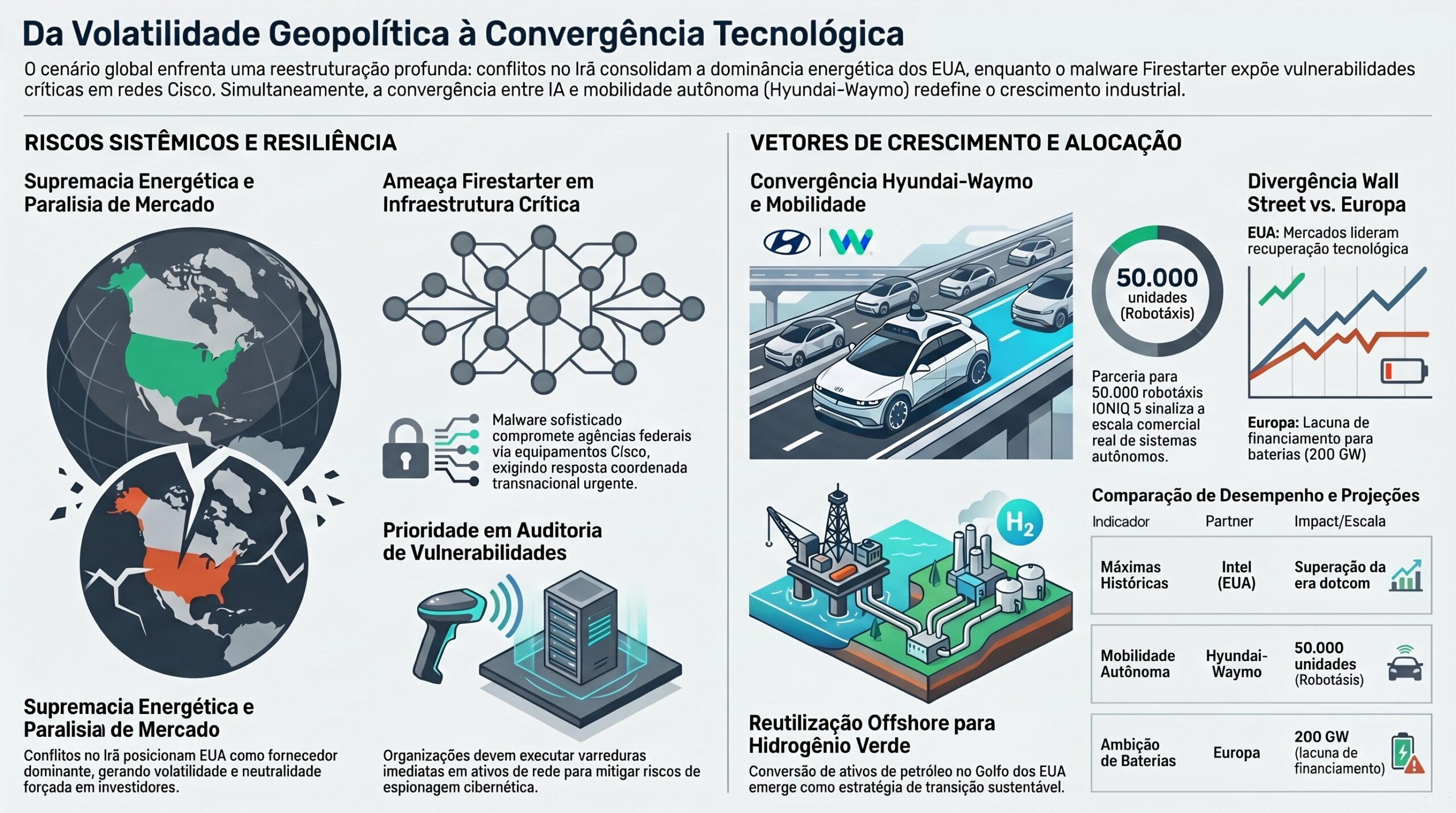 Tensões geopolíticas no Irã fortalecem posição energética americana enquanto mercados enfrentam paralisia decisória global. Malware Firestarter compromete agência federal em escalada de ameaças contra equipamentos Cisco. Parceria Hyundai-Waymo sinaliza convergência entre mobilidade elétrica e sistemas autônomos com 50.000 unidades. Wall Street supera Europa com Intel atingindo máximas históricas pós-dotcom. Sabesp diversifica para geração hidrelétrica com aprovação do Cade para Paulista Geradora.