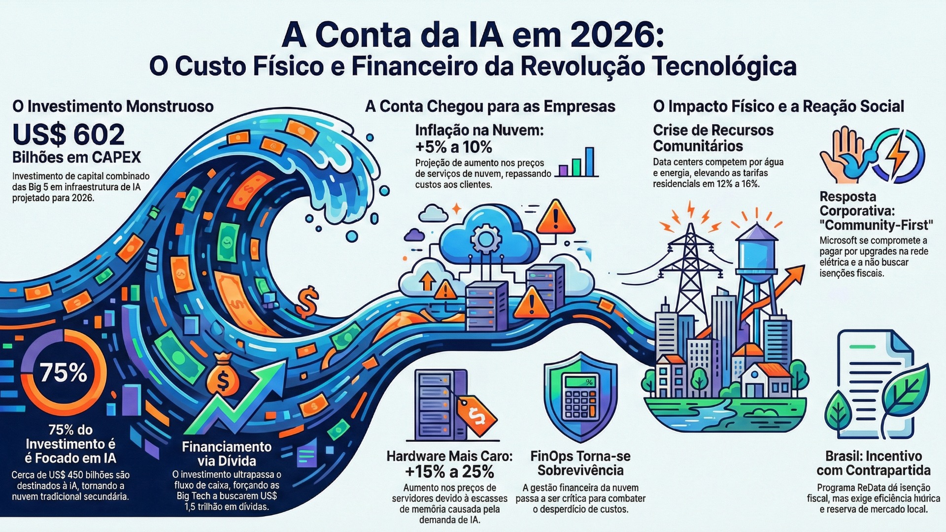 A “fatura” do investimento massivo em CAPEX das Big Tech não desaparece; ela é transferida através da cadeia de valor. Para CIOs, CTOs e CFOs de empresas usuárias (o mercado Enterprise), 2026 apresenta um cenário desafiador de inflação de custos de tecnologia. O modelo de “fazer mais com menos” da nuvem está sendo substituído por “pagar mais para inovar”.