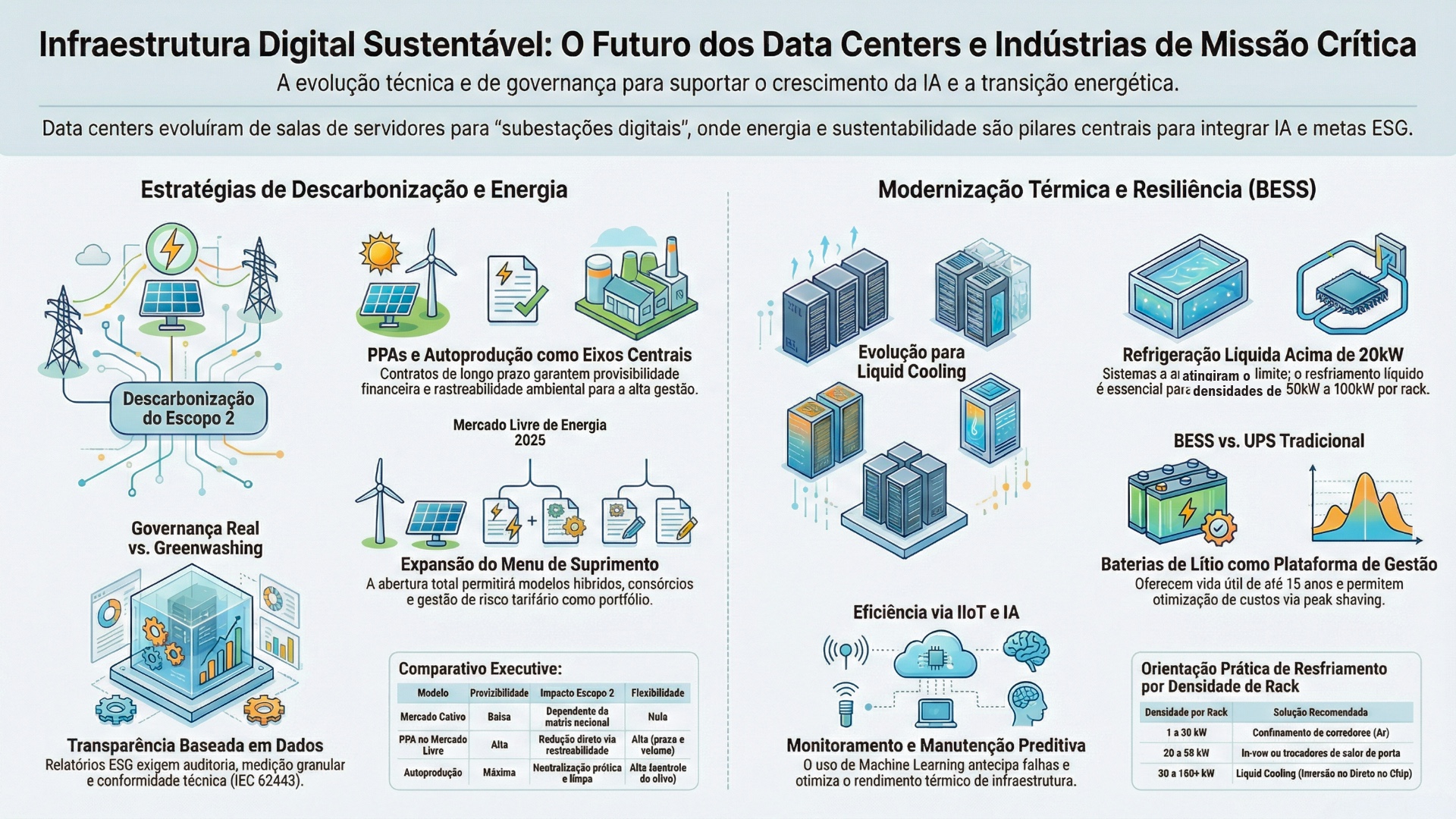 Infraestrutura crítica entrou em um ponto de inflexão: operar data centers e indústrias de missão crítica passou a exigir uma arquitetura integrada de energia, térmica, resiliência e governança. Parece uma pauta “verde”, mas é uma pauta de competitividade e continuidade. O efeito é que decisões de PPAs, ACL e autoprodução deixam de ser compra de energia e viram design de risco; decisões de liquid cooling deixam de ser upgrade e viram condição para densidade; decisões de BESS deixam de ser “backup” e viram plataforma que responde em milissegundos e cria flexibilidade econômica.