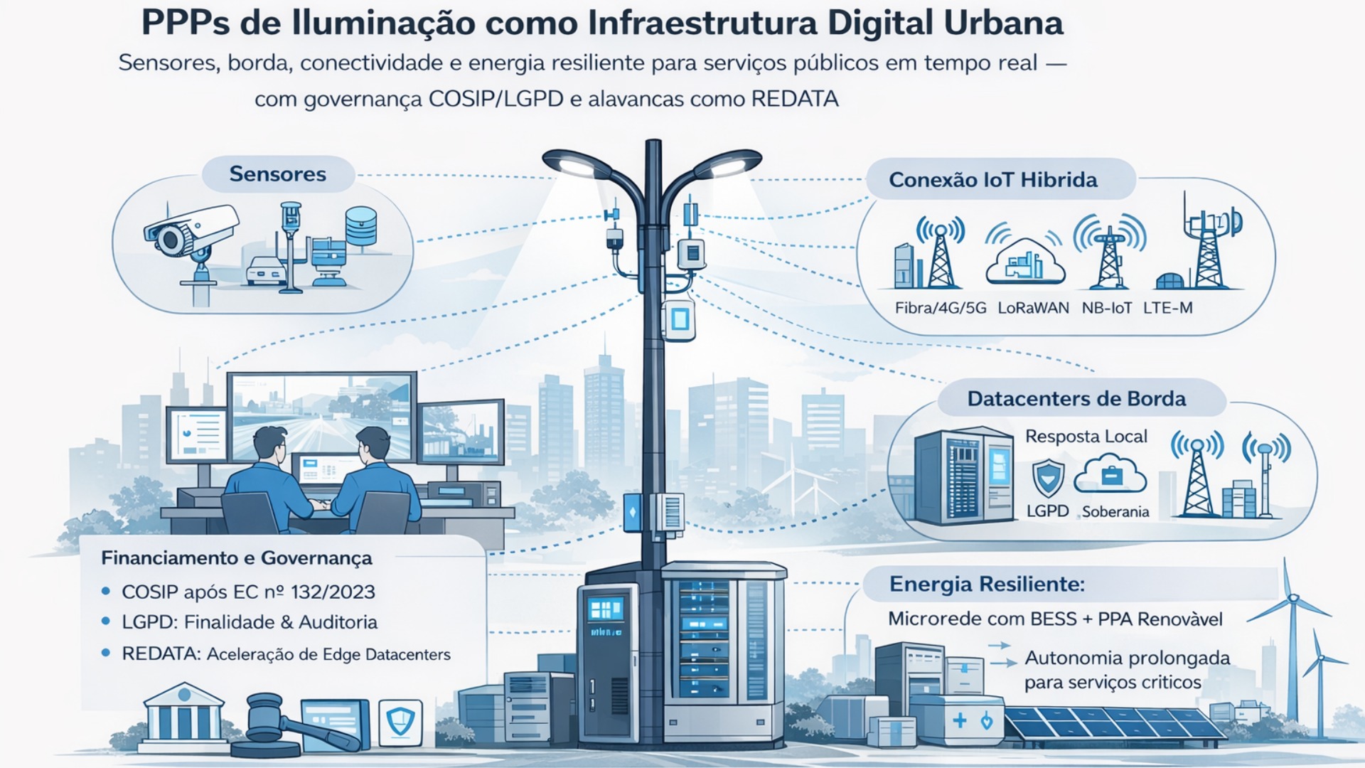 Sensores, datacenters de borda, conectividade híbrida e energia firme com governança COSIP e LGPD, com aderência ao REDATA
