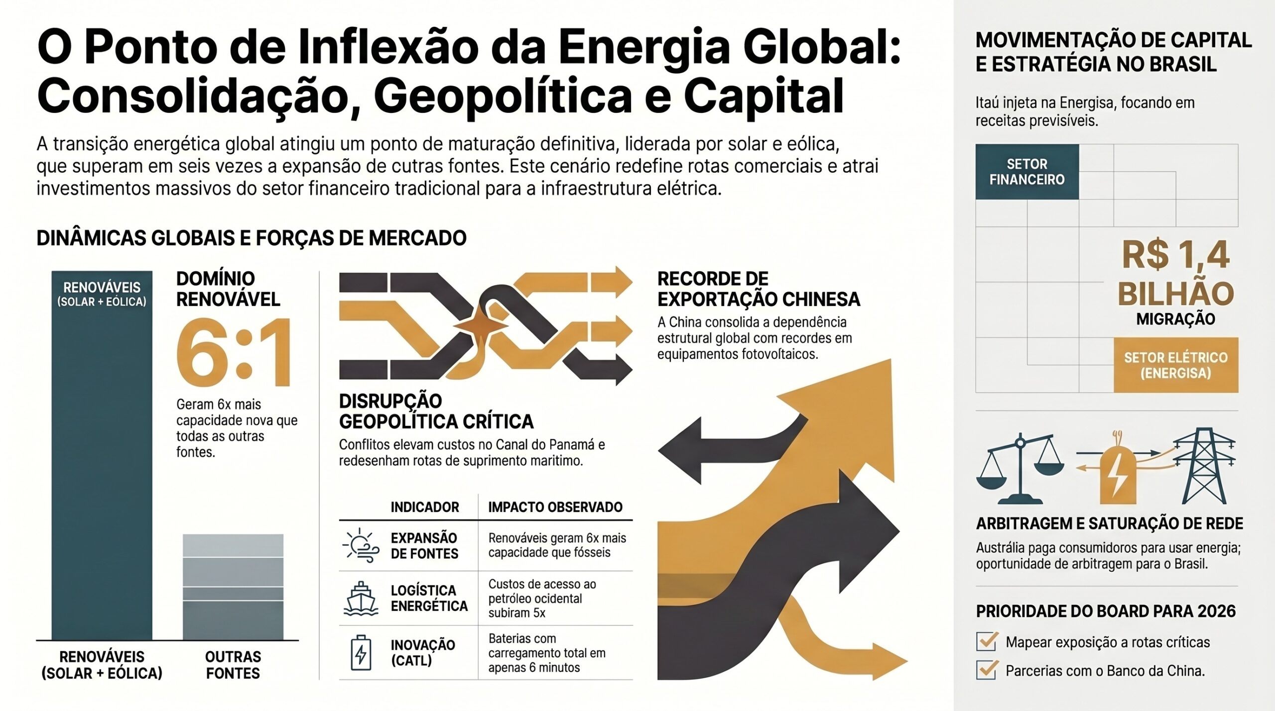 Energia renovável acelera consolidação global com movimentos disruptivos na cadeia. Solar e eólica dominam crescimento mundial com 6x mais capacidade que outras fontes. China quebra recordes de exportação solar impulsionada pela crise energética global. Conflito no Irã eleva preços do Canal do Panamá a níveis recordes. Itaú injeta R$ 1,4 bilhão na Energisa sinalizando migração financeira para infraestrutura elétrica.
