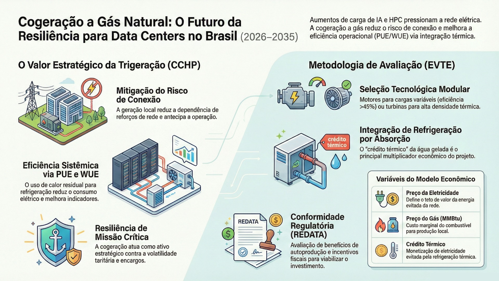 No texto, o leitor percorre uma narrativa objetiva — do contexto de mercado à tomada de decisão — conectando KPIs executivos (PUE/WUE) à engenharia de escolha tecnológica (motores vs. turbinas e absorção single vs. double effect) e a um modelo econômico com governança (baseline, dimensionamento, CAPEX/OPEX, spark spread e crédito térmico). O artigo também trata regulação e política pública como cenários, com postura conservadora: autoprodução/equiparação, componentes tarifários (como TUSD-G) e REDATA entram no modelo com disciplina de risco, não como “ajuste de última hora”.