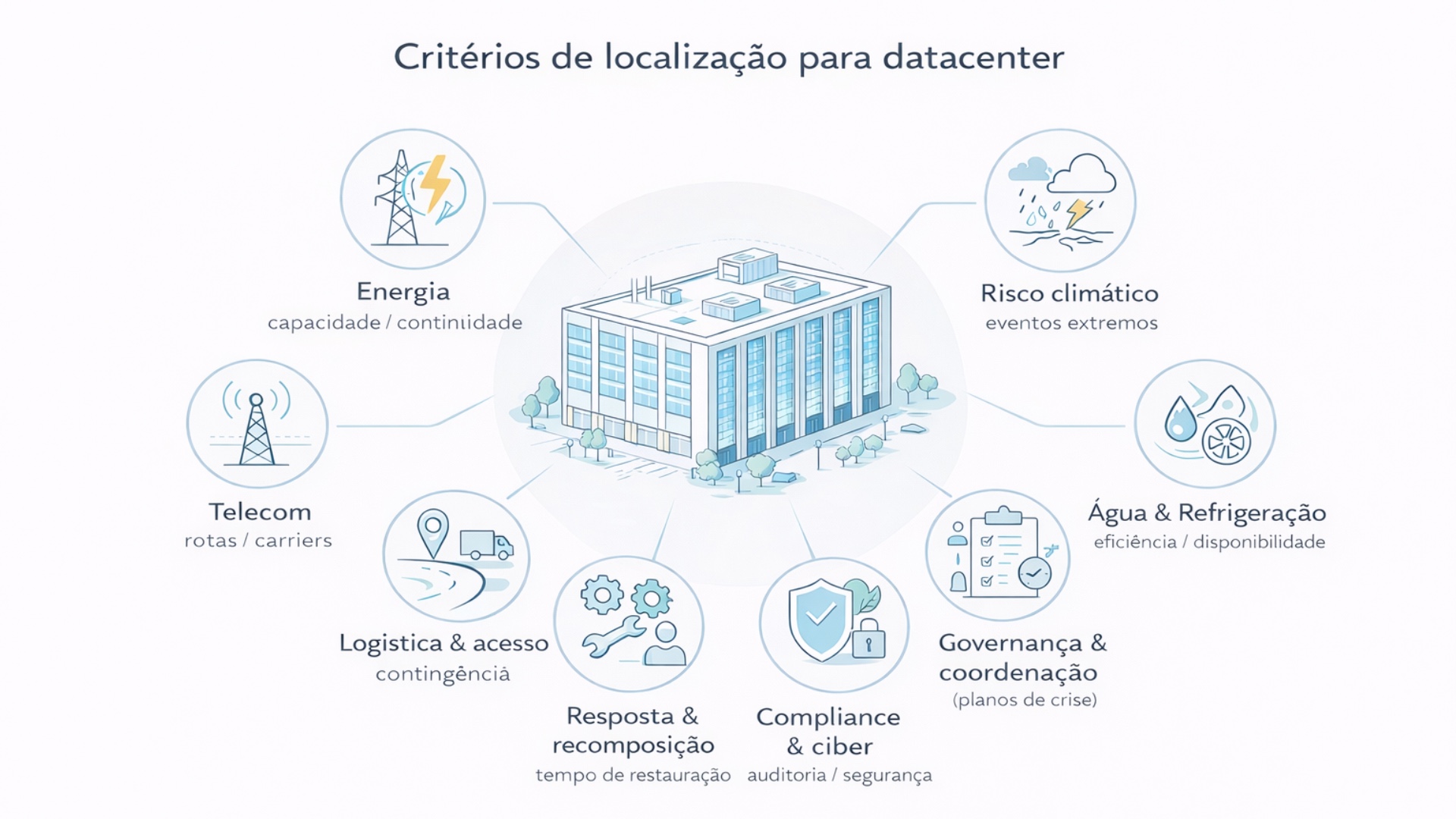 A localização de um data center deve ser tratada como um problema de infraestrutura crítica e gestão de risco sistêmico. O site não é um “ponto no mapa”. É um nó em uma rede de dependências: distribuição elétrica, transmissão, telecom, logística, gestão urbana, protocolos de crise, capacidade institucional e coordenação entre atores. O diferencial competitivo está em transformar variáveis frequentemente “invisíveis” em critérios objetivos, auditáveis e comparáveis entre cidades e regiões.