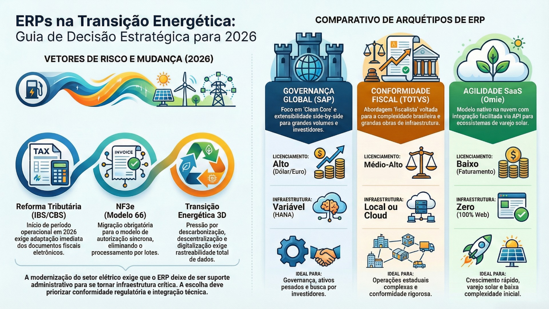 A transição energética 3D (descarbonização, descentralização e digitalização) vem elevando a exigência de compliance, rastreabilidade e integração de dados para Pequenas e Médias Empresas (PMEs) que atuam no setor elétrico brasileiro. Nesse contexto, ERPs deixam de ser apenas “backoffice” e passam a operar como infraestrutura crítica de governança, fiscalidade e integração. Este artigo propõe uma metodologia replicável de benchmarking técnico para avaliação comparativa de ERPs sob uma ótica orientada a risco, conformidade e capacidade de integração, com ênfase em dois vetores regulatórios e operacionais de alto impacto: (i) a evolução do ecossistema de documentos fiscais eletrônicos do setor (NF3e, Modelo 66) e suas notas técnicas; e (ii) o início do período operacional de testes da Reforma Tributária do Consumo (IBS/CBS) a partir de 2026, com efeitos diretos sobre documentos fiscais eletrônicos e obrigações acessórias. Como aplicação demonstrativa, são discutidos três perfis de plataforma: (a) governança e extensibilidade “side-by-side” inspirada em Clean Core (SAP); (b) aderência fiscal e operacionalidade guiada por atualizações do ecossistema DFe (TOTVS, como proxy de abordagem fiscalista); e (c) arquitetura SaaS com estratégia de integração via API e ecossistema (Omie). Ao final, recomenda-se um modelo de decisão por “fit regulatório-operacional” e maturidade de integração, mitigando vieses de seleção por marca e priorizando evidências documentais e testes reprodutíveis.