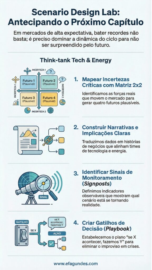 - Como líder de tecnologia ou energia: alinhar times em torno de hipóteses de futuro, riscos regulatórios e implicações de capex.